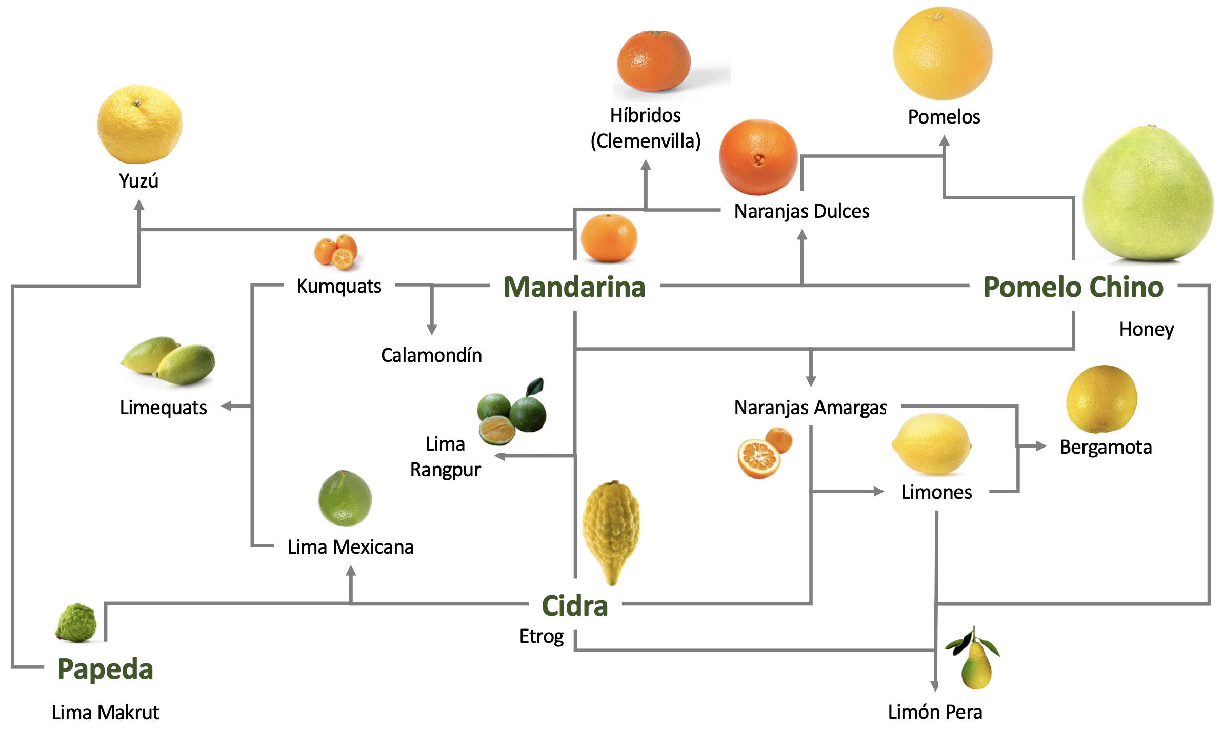 A lo largo de los milenios, la hibridación ha generado nuevas variedades. Los cítricos son oriundos del Asia oriental, desde las faldas meridionales del Himalaya hasta Indonesia, donde su cultivo data de hace más de 4,000 años. La facilidad para hibridarse hace que haya varios miles de variedades en la actualidad.